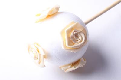 7. Na kouli začneme tavnou pistolí lepit saténové růžičky – začneme největšími.