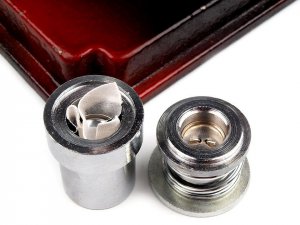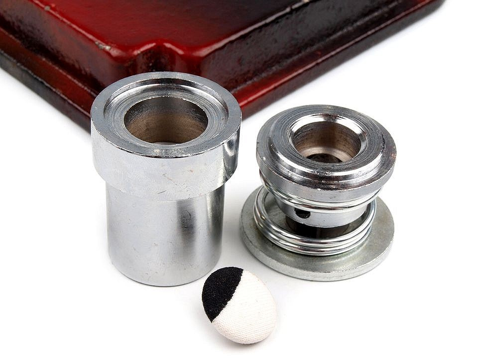 Knoflík na potahování se skládá ze dvou kovových částí - spodní je z magnetického kovu a vrchní z hliníku. Knoflíky mají spodní přišívání. K potažení můžete zvolit různé materiály.