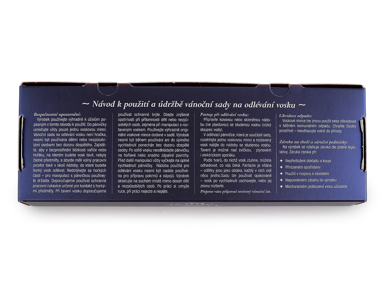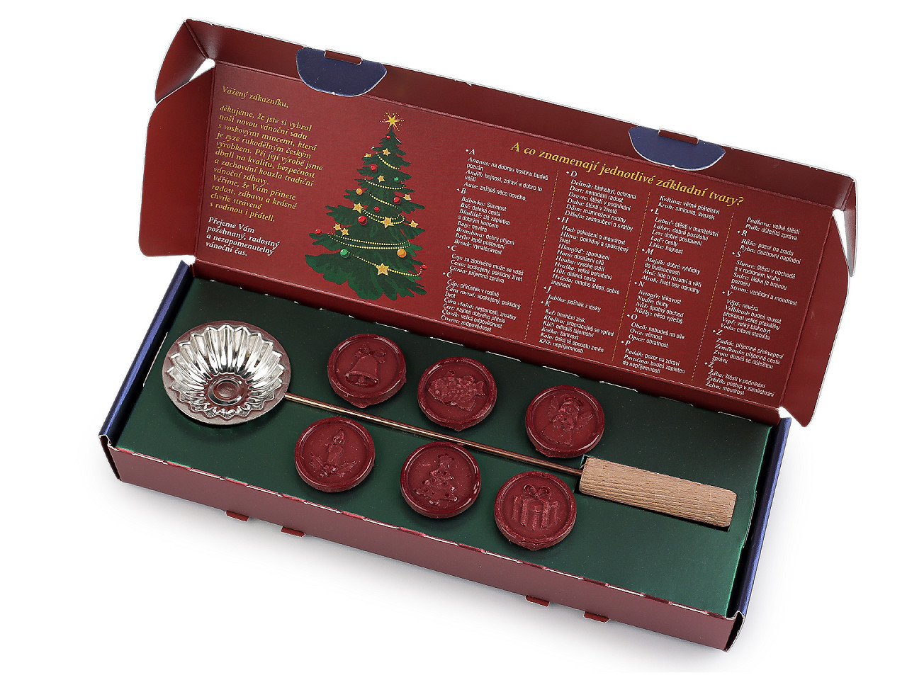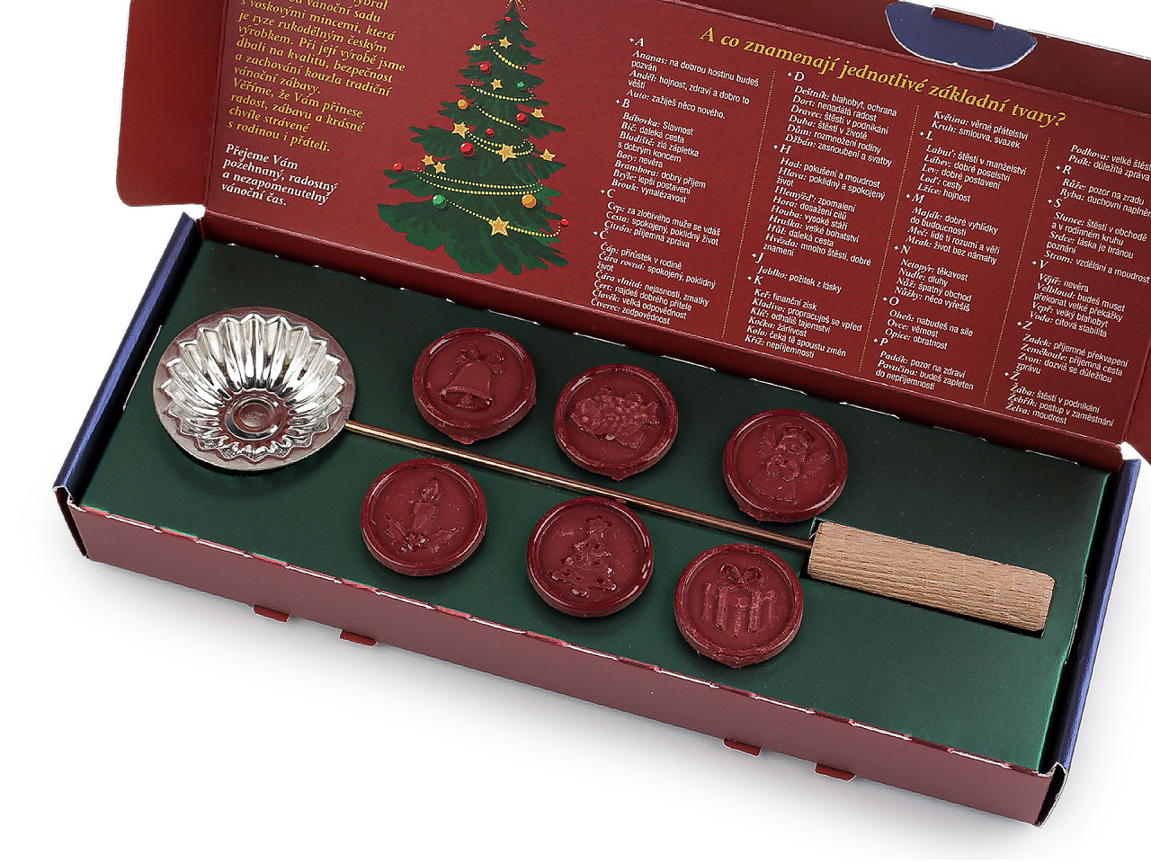 Vánoční souprava lití olova obsahuje vše, co bude k tradičnímu lití olova potřebovat - pánvičku na tavení a 6 olověných mincí ozdobených vánočními reliéfy. To vše zabalené v krásné dárkové krabici.