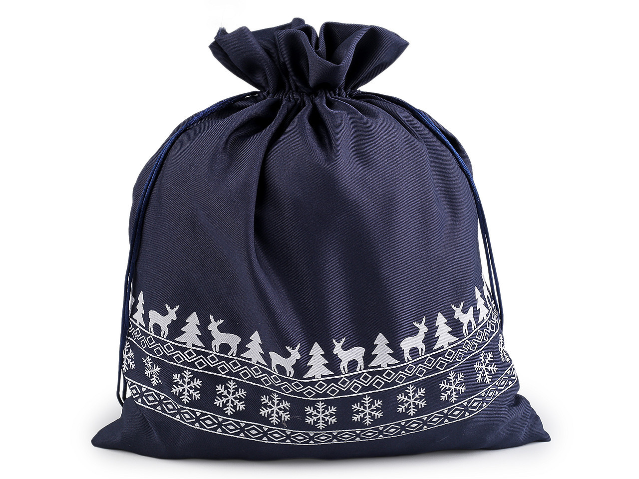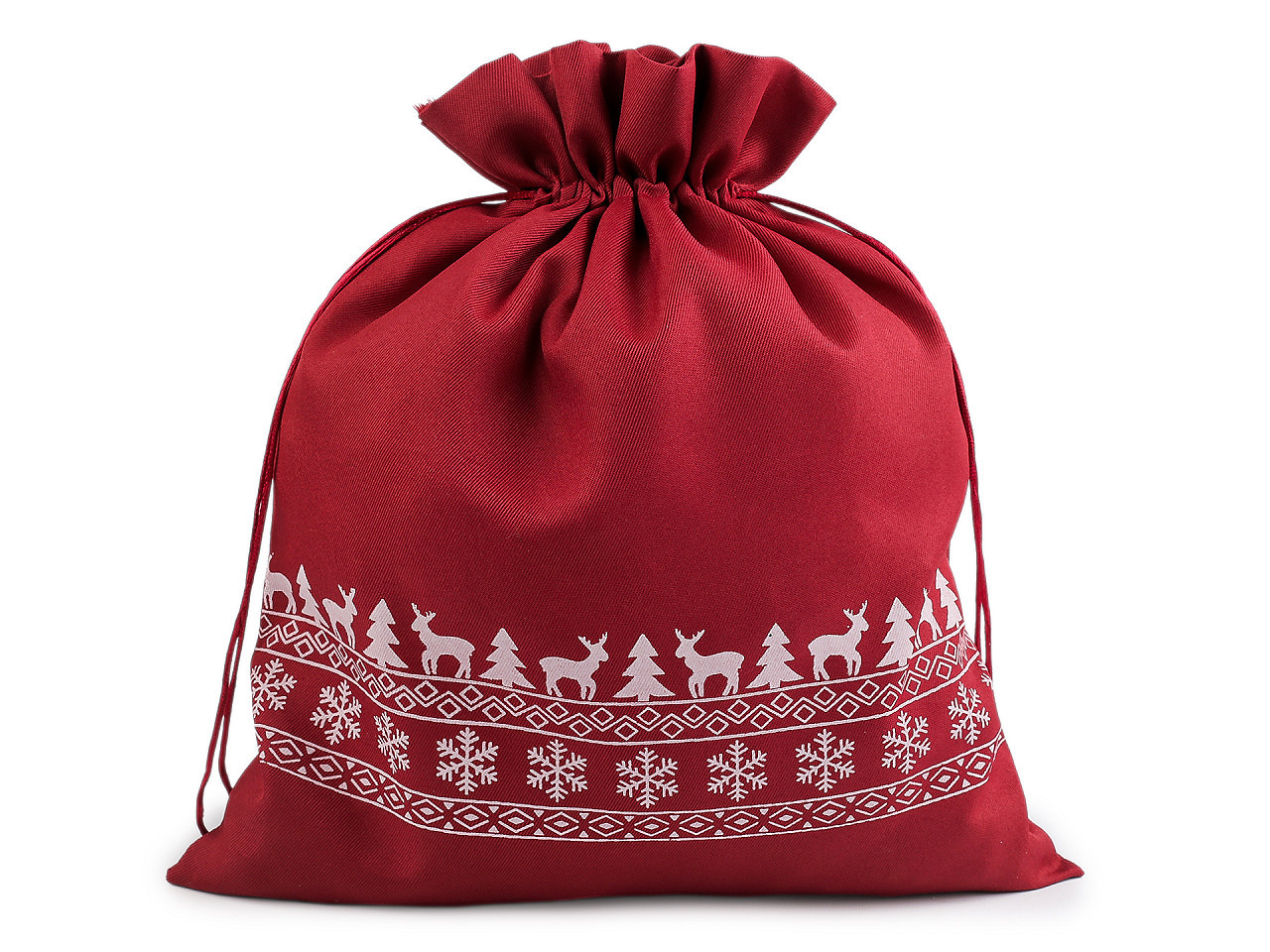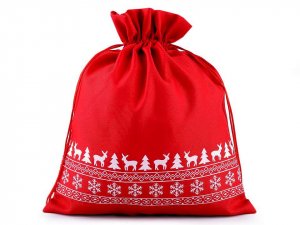 Pytlík s vánočními motivy se stahuje pomocí saténových šňůrek. Můžete ho použít na dárky nebo naplnit dobrotami na Mikuláše. Dá se naaranžovat jako vánoční dekorace.