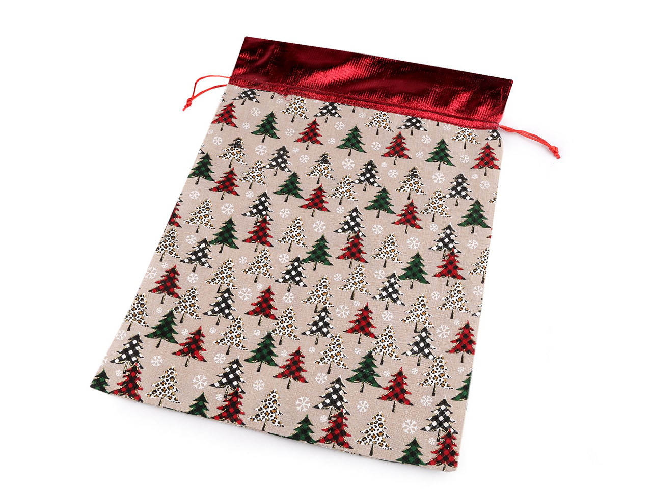 Dárkový pytlík s potiskem stromečků je ideální dekorací na Vánoce. Pytlík je zajímavý materiálem, který imituje jutu, a lesklým lemem i potiskem. Stahuje se pomocí šňůrky. Do pytlíku můžete schovat drobné dárky nebo použít jako vánoční dekoraci.