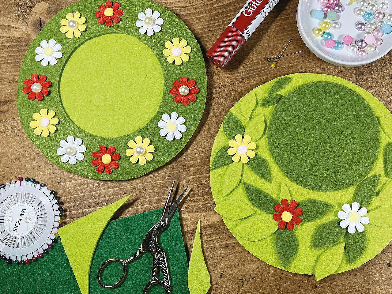 Květiny o průměru 27 mm jsou vyrobeny z na dotek příjemného materiálu. Můžete je našít jako ozdobu na oblečení nebo pomocí textilního lepidla přilepit např. na přání.