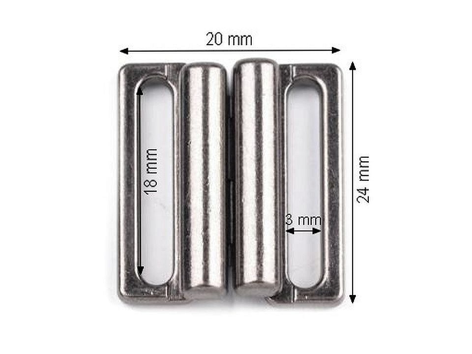 Vnitřní šíře pro uchycení je 18 mm. Rozměry jedné spony jsou: 15 x 24 mm, obou spon 20 x 24 mm, viz. foto.