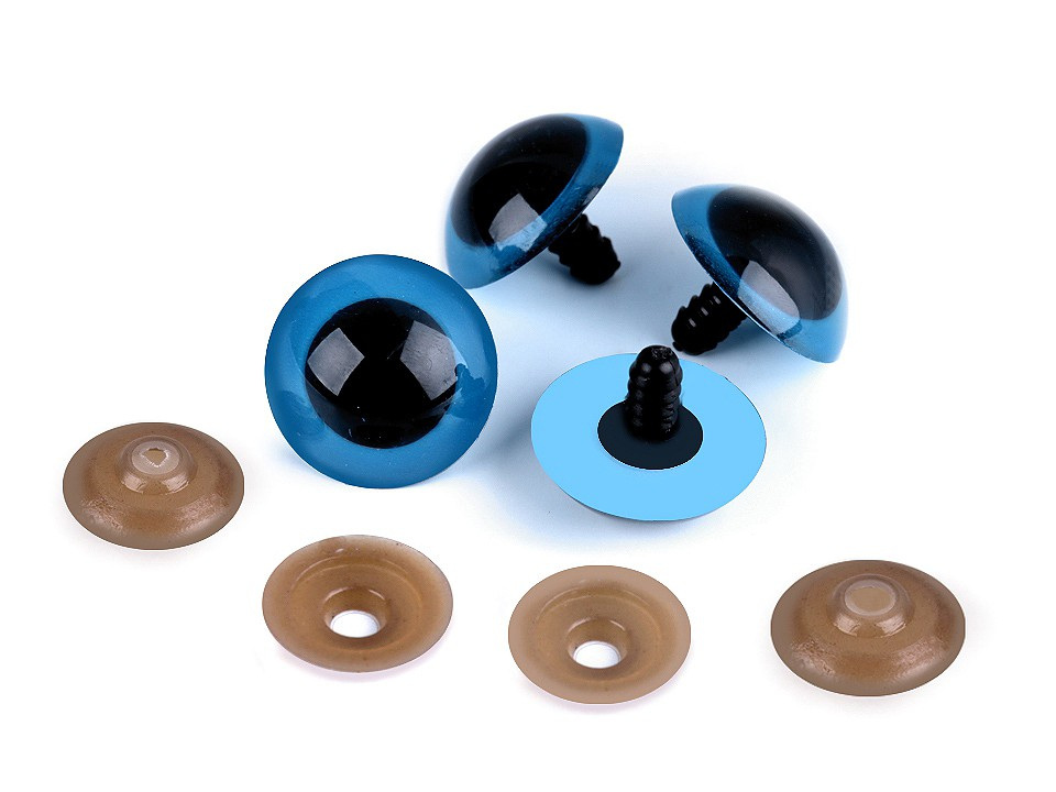 Velké polokulaté oči s barevnou duhovkou využijete při výrobě nejrůznějších postaviček či zvířátek. Mají závit, který se provleče materiálem, a z druhé strany se pak nacvakne pojistka, která oči bezpečně připevní na místo.
