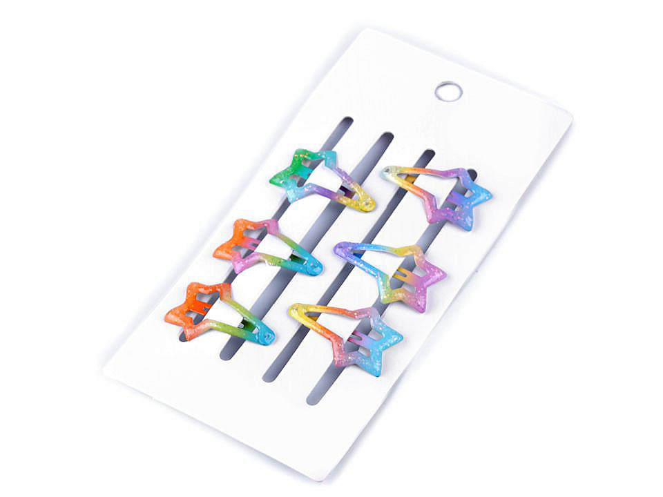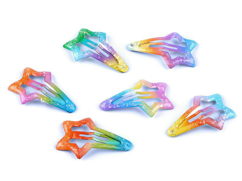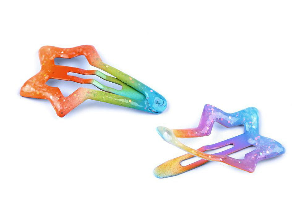Malé duhové sponky s hvězdou se díky zalitým glitrům poutavě třpytí. Hodí se do jemných dětských vlásků. Mají výhodu, že dobře drží a přitom netlačí. Jsou vyrobené z kvalitního materiálu, který dlouho drží svůj tvar, funkčnost i barvy.