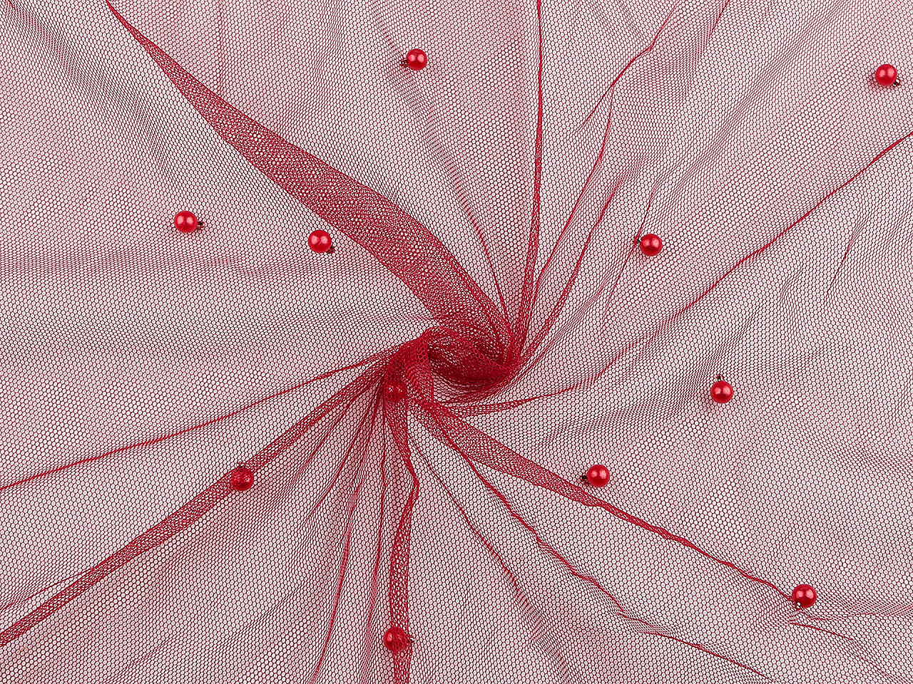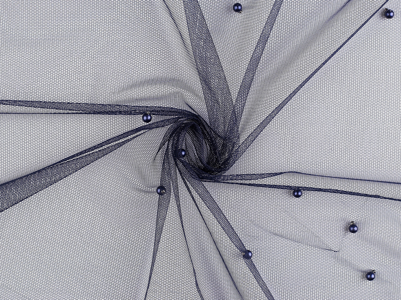 Jemný tyl zdobí přinýtované perly. Je vhodný na výrobu svatebních závojů, šatů, sukní apod.
