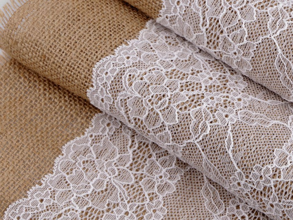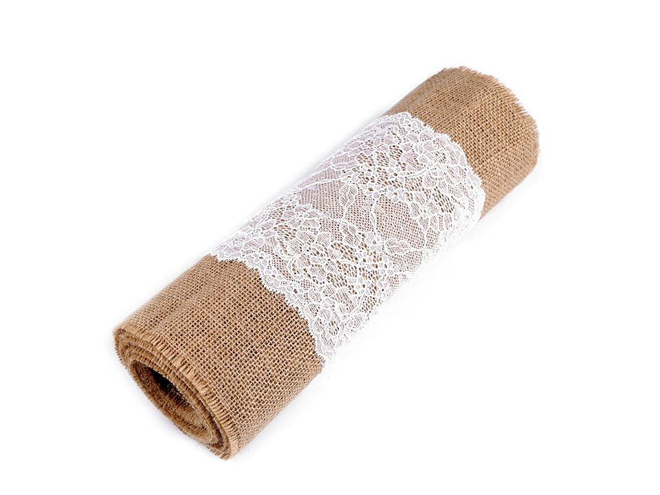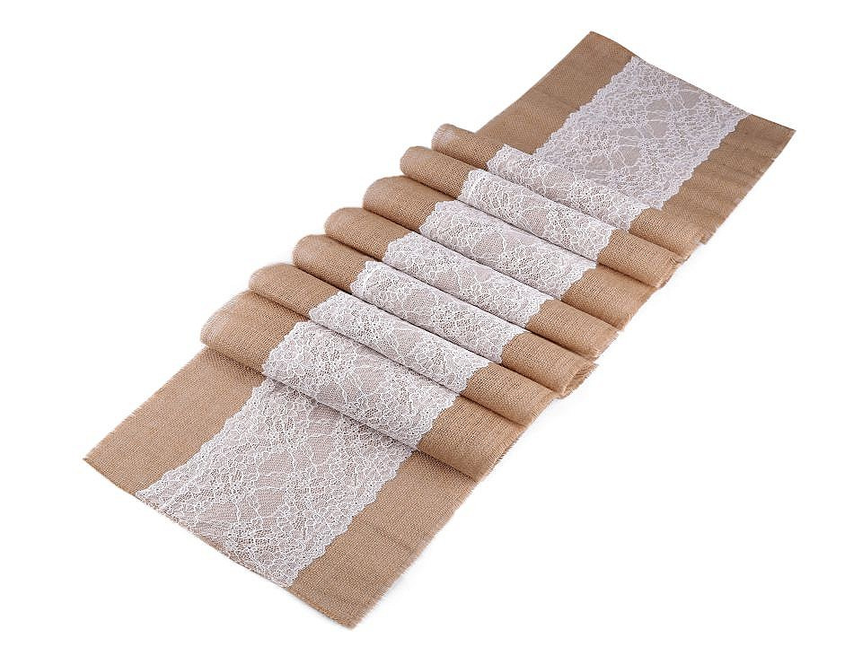 Běhoun z juty má střed ozdobený romantickou krajkou. Běhoun vám poslouží k ozdobení středové části stolu. Využijete ho nejen doma, ale i na svatbách a různých oslavách, kterým dodá romantickou atmosféru.