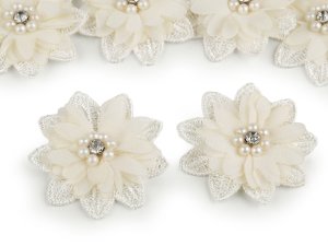 Něžný textilní květ je zhotovený z krajkového základu a dalších vrstev, které jsou šifónové. Jeho střed zdobí korálky a třpytivý kamínek. Květy můžete našít či nalepit na svetříky, halenky, šaty, kabátky, psaníčka, tašky nebo klobouky a čepice. Je vhodný i na tvorbu broží a různých vlasových ozdob.