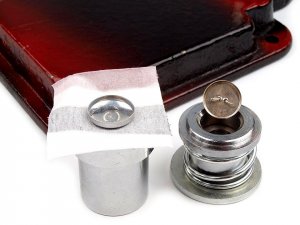 Knoflík na potahování se skládá ze dvou kovových částí - spodní je z magnetického kovu a vrchní z hliníku. Knoflíky mají spodní přišívání. K potažení můžete zvolit různé materiály.