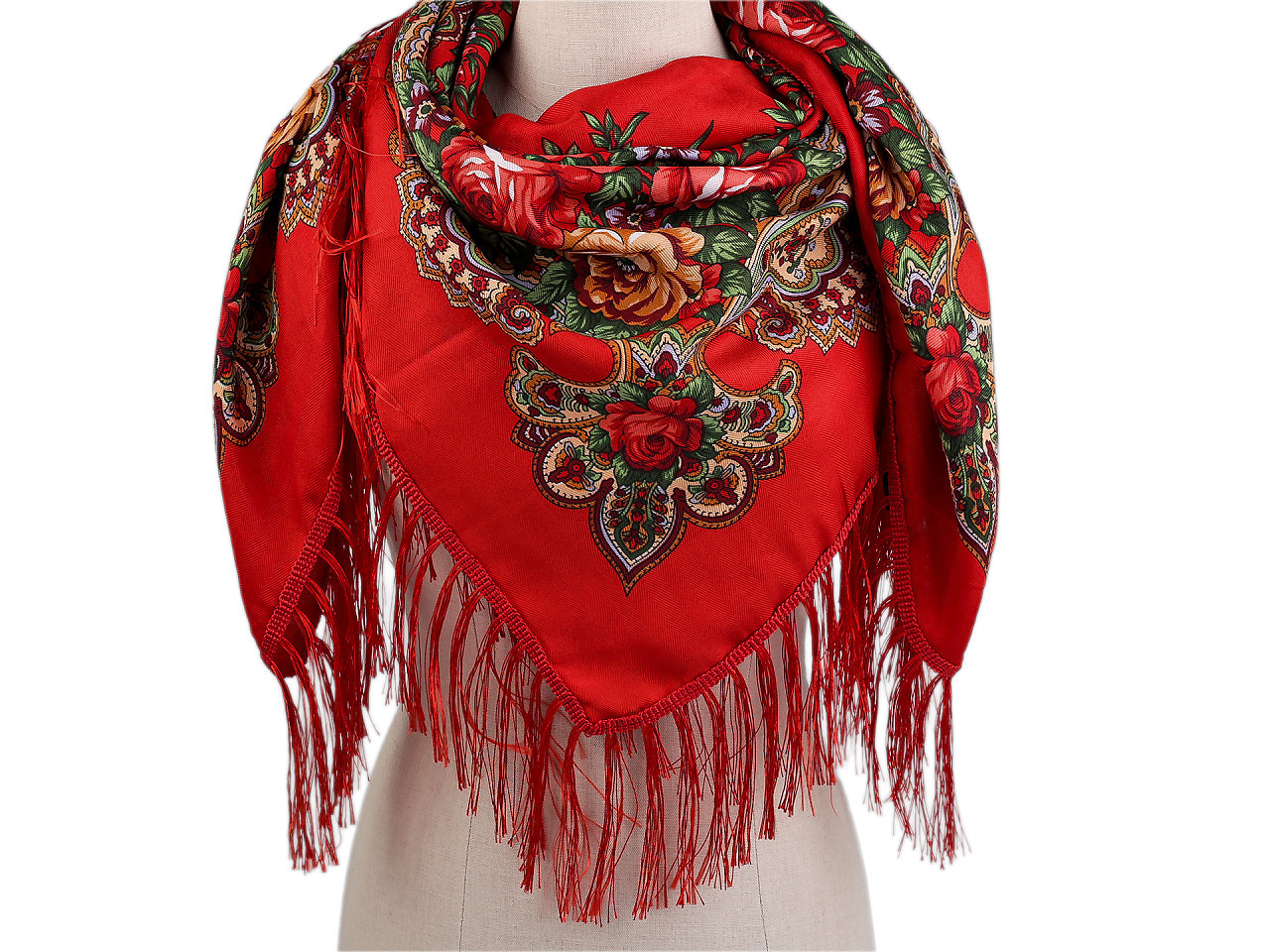 Velký folklórní šátek je doslova jako z dob našich babiček. Býval součástí tradičního oblečení a krojů. Je vyrobený z příjemného materiálu, na všech stranách je ozdobený dlouhými střapci, které krásně splývají. Velký čtvercový tvar, můžete variabilně upravit, využijete jej jak při nošení pod krkem, tak i na zádech.