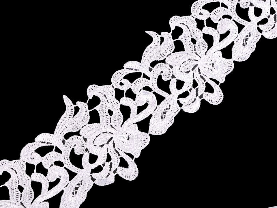 Vyšívaná krajka je zajímavá svým precizním zpracováním a působivým designem s ornamenty.