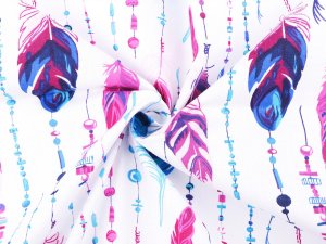 Bavlněnou látku s motivy peříček využijete na šití polštářů, povlečení, závěsů, mantinelů do postýlek i hnízd pro děti. Je vhodná také na šití roušek.