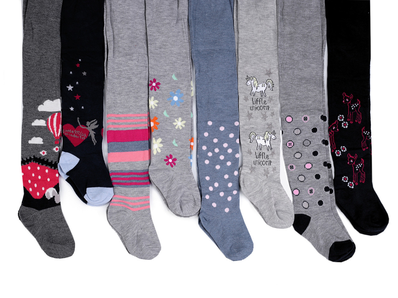 Barevné dívčí punčochy jsou zajímavé svým designem s různými motivy. Jsou z měkkého bavlněného materiálu. Mají pružný pas, příjemně se nosí.