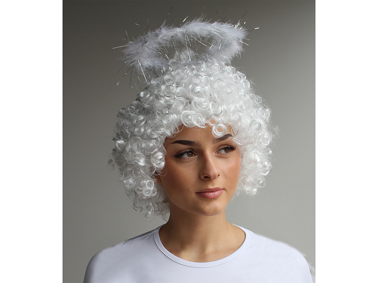Svatozář je k plastové čelence připevněná pomocí bílých drátů. Díky nim si ji můžete natáčet a tvarovat do různých poloh. Samotná aureola je vyrobená z drátu potaženého péřovou girlandou, ve které jsou vetkané stříbrné lamely. Díky nim se nebesky třpytí. Průměr svatozáře je 15 cm, průměr péřové ozdoby je cca 4 cm. Nad hlavou se vznáší ve výšce 7 cm.
