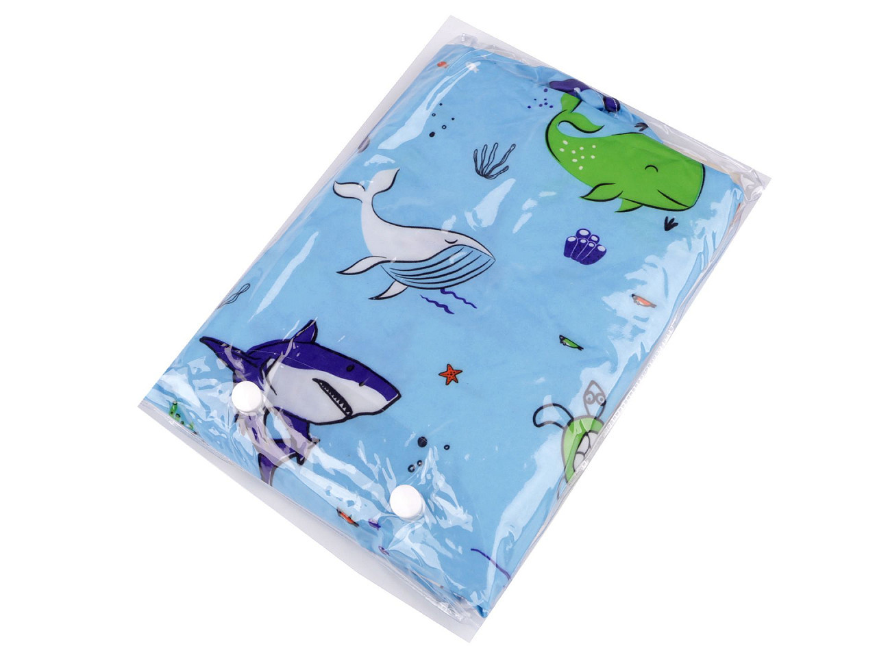 Kvalitní dětskou pláštěnku s veselými barevnými obrázky si děti oblíbí na první pohled. Je vyrobená z velice pevného materiálu. Zapíná se na druky. Kapuce má stahovací šňůrku. Pláštěnka je zabalená v ochranném pouzdru.