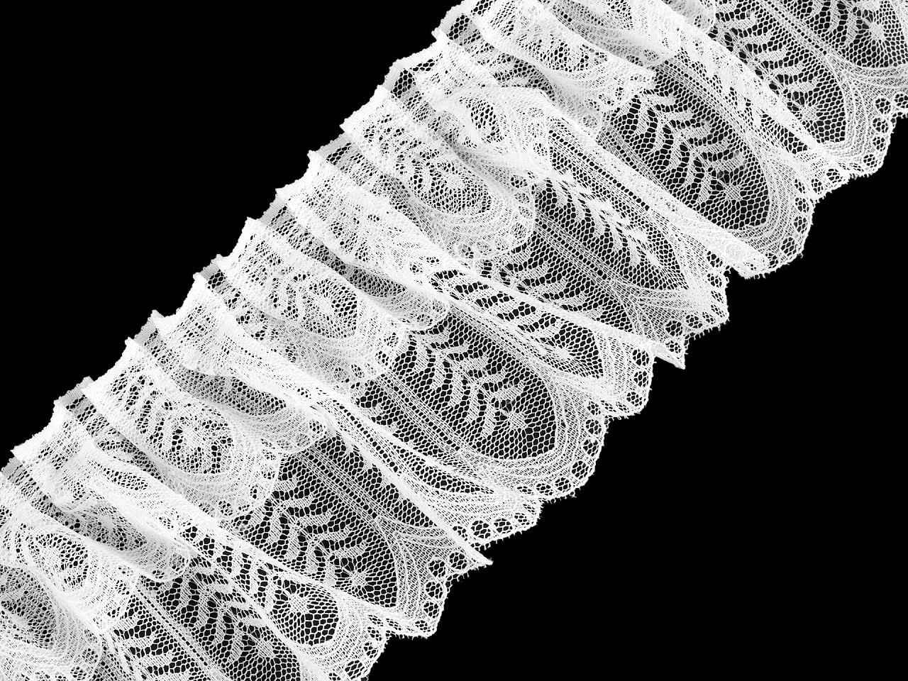 Použití: Řasenou krajku oceníte při zdobení oděvů. Můžete dát originální nádech svým halenkám, sukním nebo šatům. Je vhodná také jako dekorace bytových doplňků, například polštářů či závěsů.