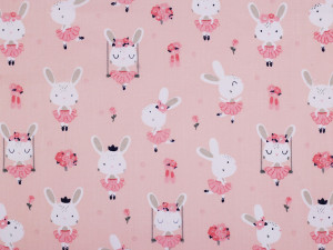 Bavlněná látka s potiskem králíčků je vhodná na šití polštářů, povlečení, pytlíků, tašek, kapsářů, mantinelů do postýlek i hnízd pro děti.