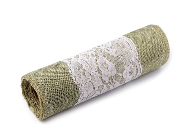 Imitaci juty zdobí uprostřed jemná krajka. Textilie má obšité kraje.