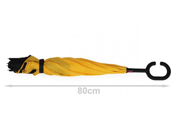 Obrácený deštník s okrasně perforovaným vnitřním potahem má revoluční řešení konstrukce. Díky opačnému otevírání a zavírání deštníku směrem vzhůru voda zůstane schovaná uvnitř v deštníku. Je to veliká výhoda např. když usedáte do automobilu, voda na vás již při zavírání nesteče, ale zůstane v deštníku. Jistě oceníte i jeho praktické sušení. Deštník sám stojí, stačí jej postavit na vhodné místo a voda sama steče ven, deštník už nemusíte rozevírat. Rukojeť ve tvaru C umožňuje deštník zaháknout přímo na paži, vaše ruce zůstanou volné např. k telefonování.