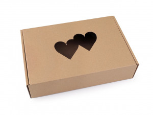 Papírová krabice má ve víku výřez ve tvaru dvou srdcí. Výřez je zespodu podlepený průhlednou fólií. Krabici využijete na balení dárků, šátků, svatební výslužky apod. Můžete si ji i dozdobit podle svého vkusu.
