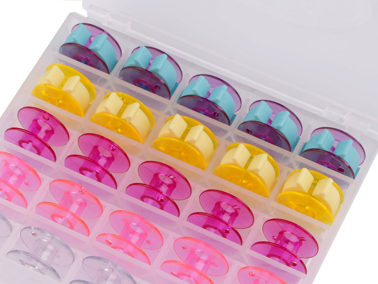 Box s cívkami k šicímu stroji je při šití skvělým pomocníkem. Uvnitř najdete 15 ks klasických cívek a 10 ks cívek se speciálním držákem, díky kterému se nitě samovolně neodmotají.