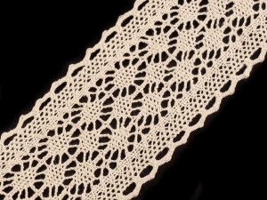 Bavlněnou paličkovanou krajku zdobí efektní vzor s kolečky. Doporučujeme ji žehlit přes tkaninu.