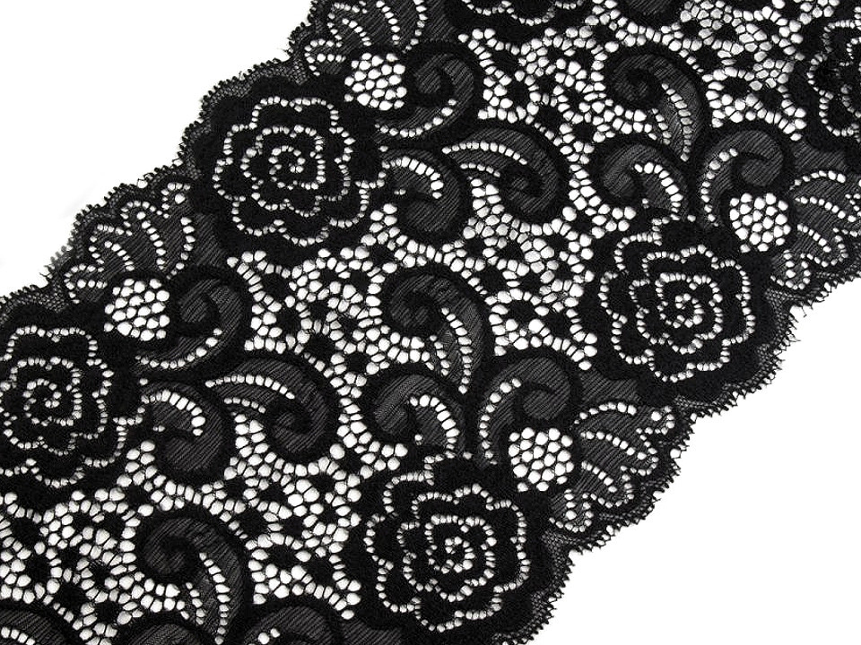 Elegantní krajka je pružná. Zdobí ji jemné květinové motivy.