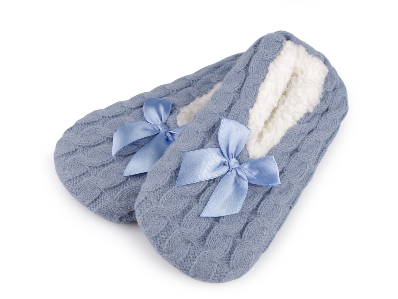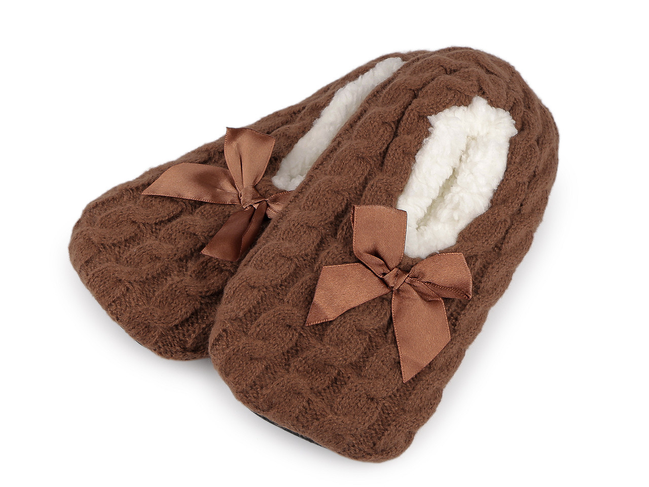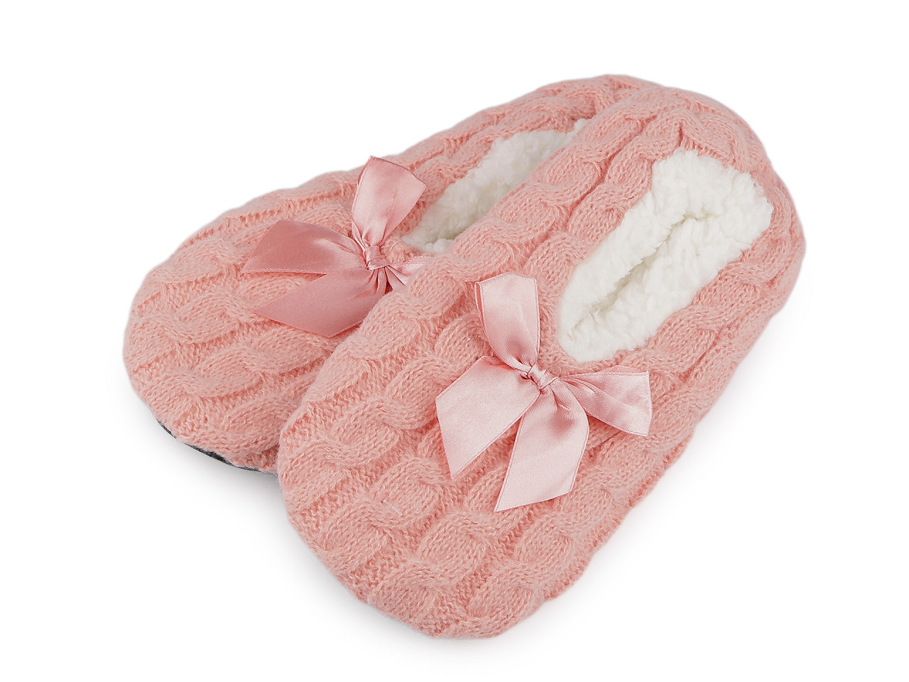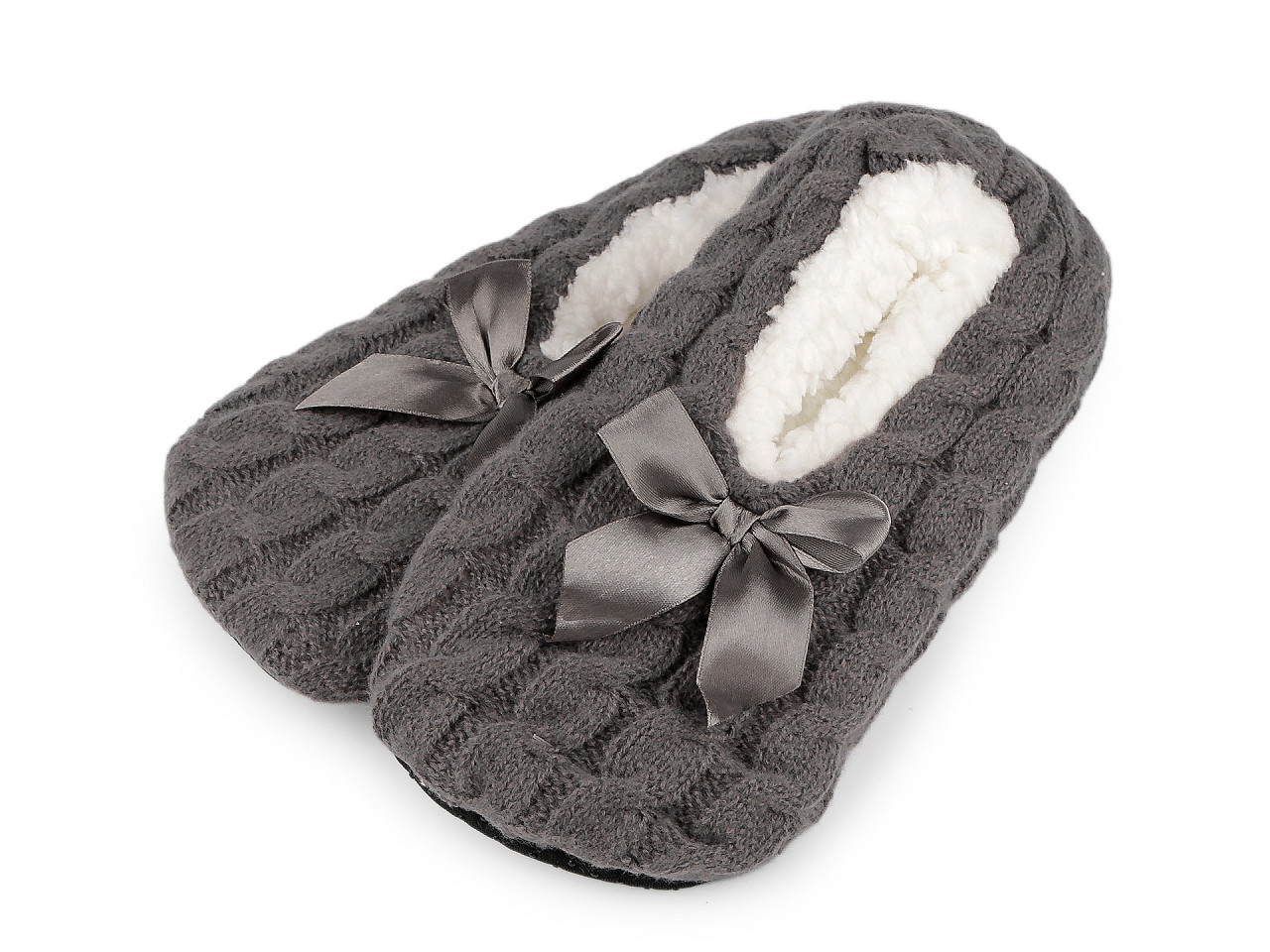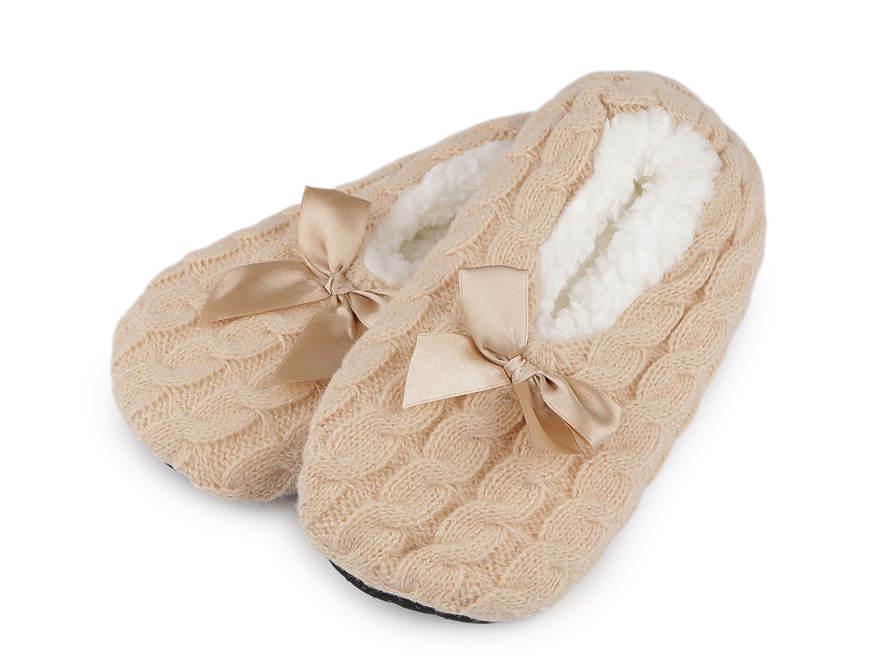 Dámské balerínky jsou skvělé jako domácí obuv. Z vrchní strany je pletenina s copánkovým vzorem, uvnitř je teplá chlupatá podšívka, která věrně imituje vlnu. Protiskluzové gumové tečky na chodidle zabrání uklouznutí.