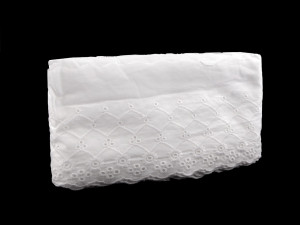 Bavlněnou madeiru zdobí okraj lemovaný typickou dírkovanou výšivkou. Využijete ji nejen na zdobení bytových doplňků (ubrusů, závěsů, polštářů apod.), ale i na halenky, sukně, dětské zavinovačky a lidové kroje.