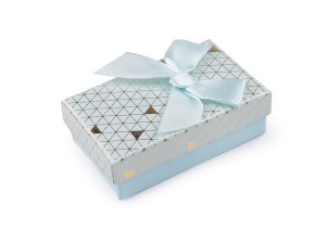 Papírová krabička s mašličkou má horní víčko s jemným perleťovým leskem a efektním metalickým potiskem hvězdných souhvězdí. Uvnitř je klasická molitanová výplň s průřezem na náušnice a prsten, která se dá vyjmout. Krabička je velmi pevná, šperky v ní můžete dlouhodobě uchovávat. Do krabičky můžete zabalit i jiné drobné dárky. S touto luxusní krabičkou obdarovaný pocítí, že vám na něm opravdu záleží.
