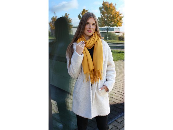 Velká jednobarevná šála je velice kvalitní, vyšší gramáže, komfortně vás zahřeje v sychravých dnech. Je vyrobená z materiálu příjemně hebkého na dotek. Hodí se ke kabátu, bundě i svetru. Na koncích je zakončená dlouhými třásněmi.