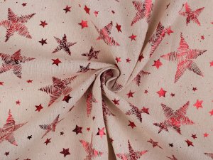Hrubší bavlněná látka svou plátnovou vazbou imituje látky ze lnu. Zdobí ji metalický potisk hvězd. Využijete ji na šití ubrusů, dekoračních polštářů, tašek, pytlíků, ubrusů, prostírání apod.