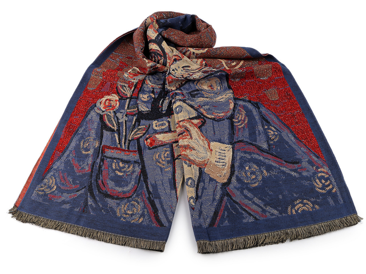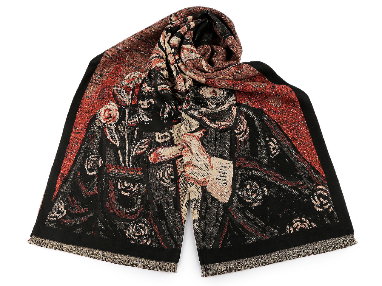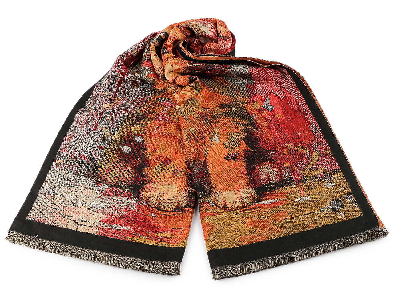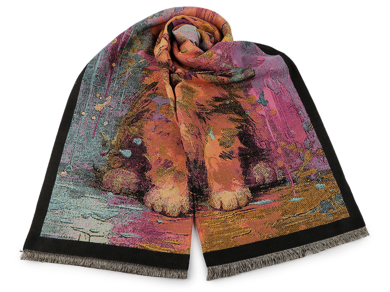 Velká šála typu kašmír je vyrobená z hřejivého materiálu, který je příjemně hebký na dotek. Je ozdobená obrázky různých koček. Krásně vás zahřeje v chladném a sychravém počasí. Na koncích je zakončená krátkými třásněmi.