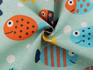 Látku imitující len zdobí motiv s rybičkami. Je vhodná na šití ubrusů, běhounů, prostírání, dekoračních polštářů, tašek, dětských teepee apod.