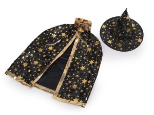 Dětský čarodějnický karnevalový kostým se skládá z klobouku a pláště. Jeho nositel získá úchvatný vzhled čaroděje, kouzelnice, mága nebo černokněžníka. Klobouk dobře drží tvar. Plášť je pevný, s límcem a zavazováním kolem krku. Kostým je ozdobený metalickým potiskem hvězd.