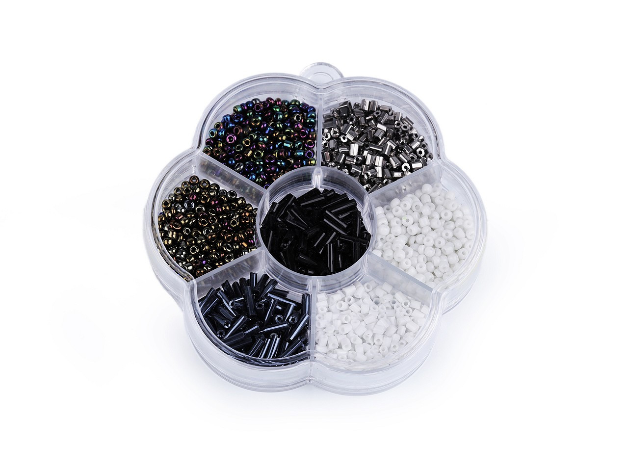 Plastový box ve tvaru květu obsahuje barevný mix skleněného rokajlu a tyček. Sadu využijete na tvorbu bižuterie a vánočních ozdob.