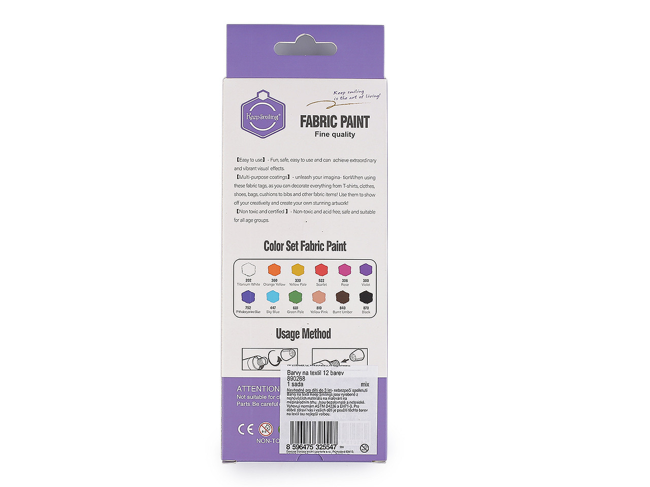 Sada barev na textil Keep Smilings je vyrobená z nejnovějších materiálů na malování na mezinárodním trhu. Barvy jsou bezolovnaté a netoxické. Vyhovují normám ASTM D4236 a EN71-3. Pro dobré zdraví vás i vašich dětí je použití těchto barev na textil tou nejlepší volbou. V balení najdete 12 barevných odstínů v uzavíracích tubách o obsahu 6 ml.