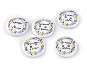 Dřevěné dekorační knoflíky zdobí květinový potisk a nápis "Vyrobeno s láskou". Vyniknou na ručních výrobcích, dárcích a různých dekoracích. Můžete je použít také ve scrapbookingu.
