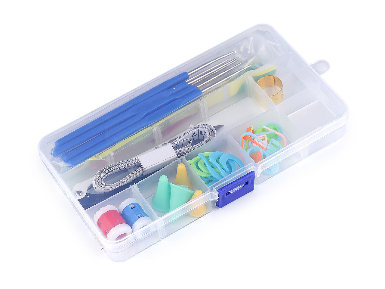 Sada háčků a pomůcek na háčkování je přehledně uložena v plastovém boxu.