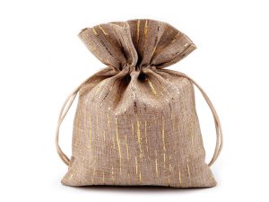 Dárkový pytlík s metalickým potiskem připomíná svým materiálem přírodní jutu. Snadno se uzavírá pomocí dvou stahovacích saténových šňůrek.