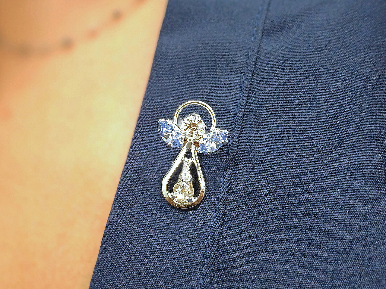 Rozzařte svůj outfit s touto malou, ale výraznou broží, která okamžitě přidá nádech luxusu a elegance. Tato brož/odznak s motivem vločky nebo anděla je klenotem prvotřídní české kvality, vyrobeným z pravé jablonecké bižuterie.