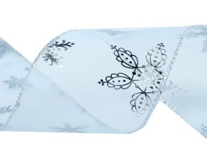 Široká organzová stuha je po stranách obšitá třpytivým lurexem se silonem. Je průsvitná, ozdobená metalickým potiskem sněhových vloček. Potisk je jednostranný, působivě se leskne.