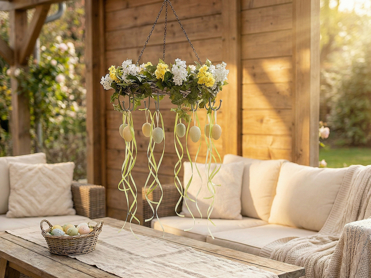 Závěsný proutěný věnec v rustikálním stylu využijete k celoročnímu aranžování. Vyniknou na něm vánoční, velikonoční, podzimní i letní dekorace.