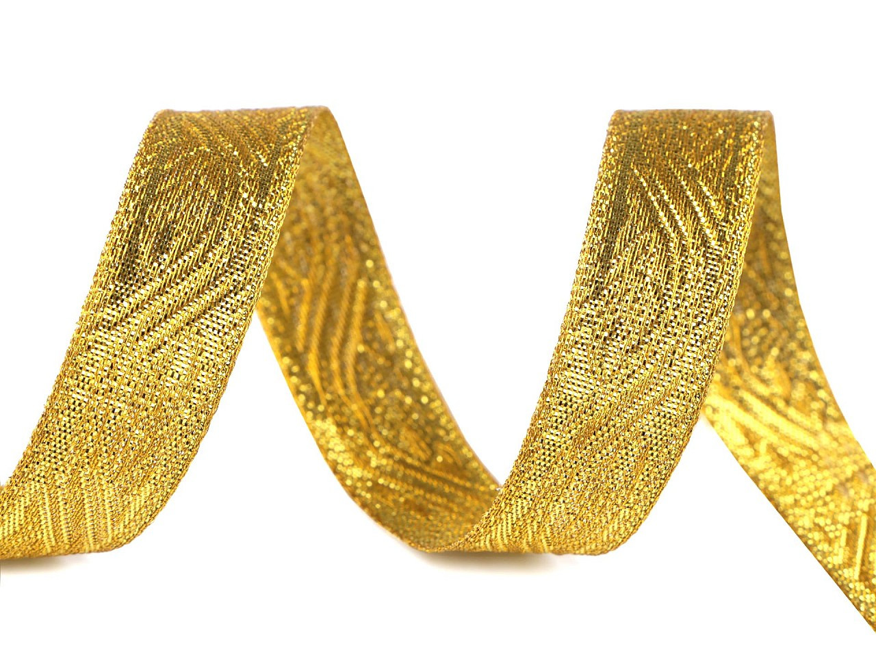 Třpytivou dekorační stuhu zdobí ornamenty z hustě protkaného lurexu. Je měkká, ale přitom pevná, uvázané mašle drží pěkně tvar. Je jednostranná, ale rubová strana je také pěkná.