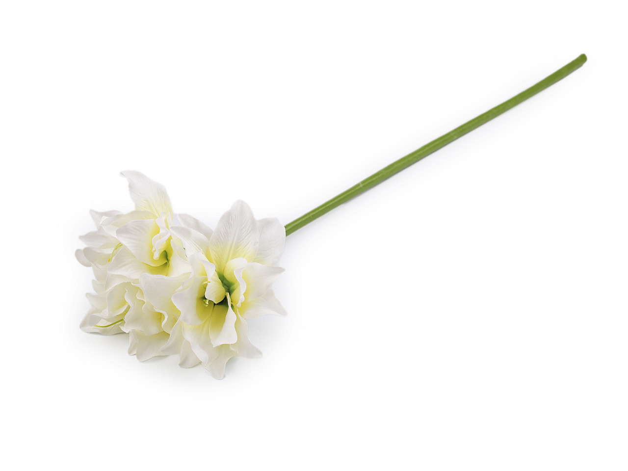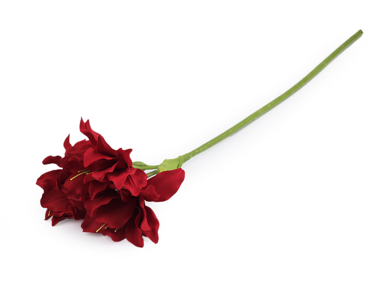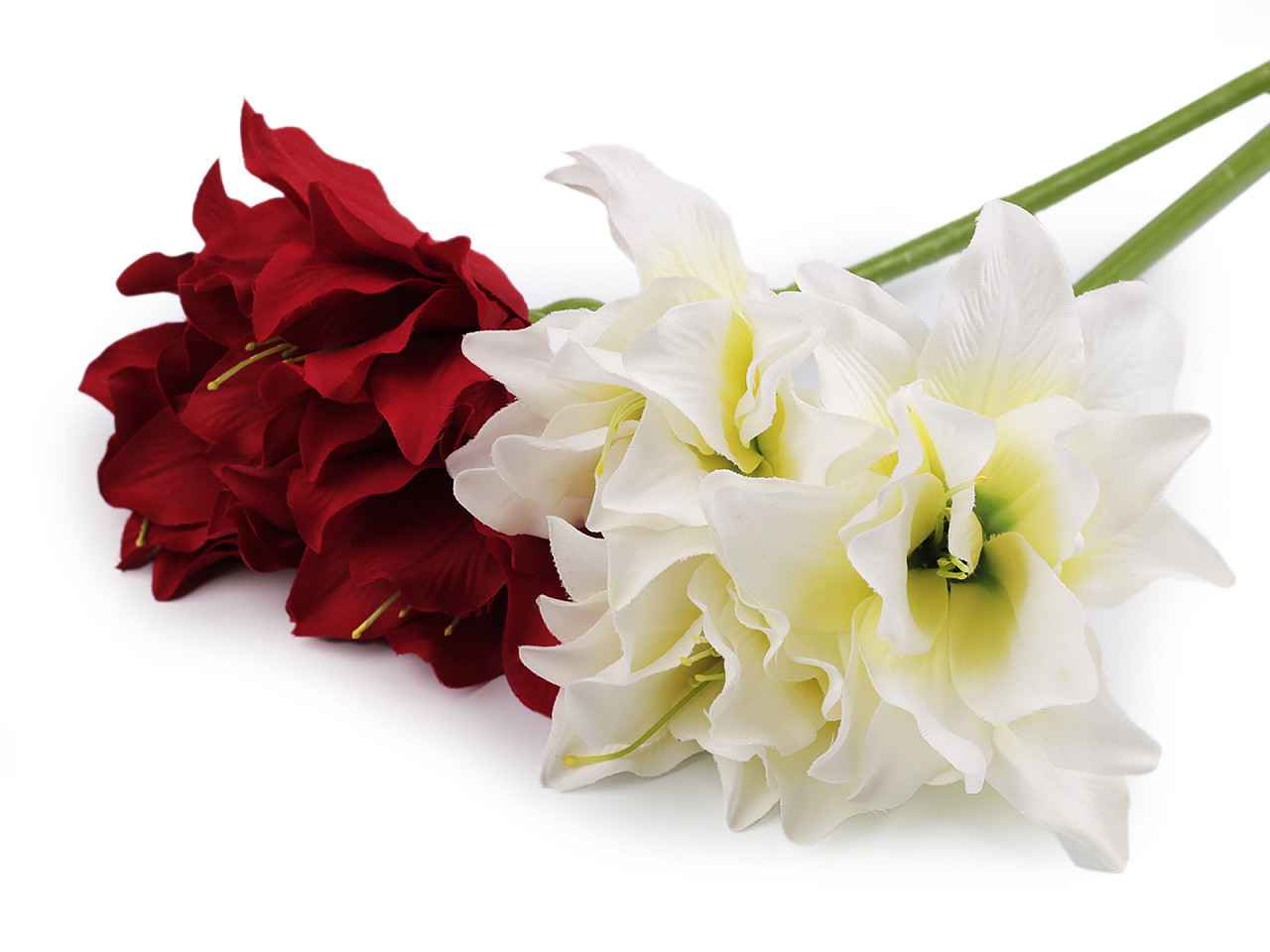 Umělý amarylis vynikne v květinových vazbách a aranžmá, ale i v jednoduché váze. Stonek je pevný, bez drátu uvnitř. Květy a listy jsou textilní.