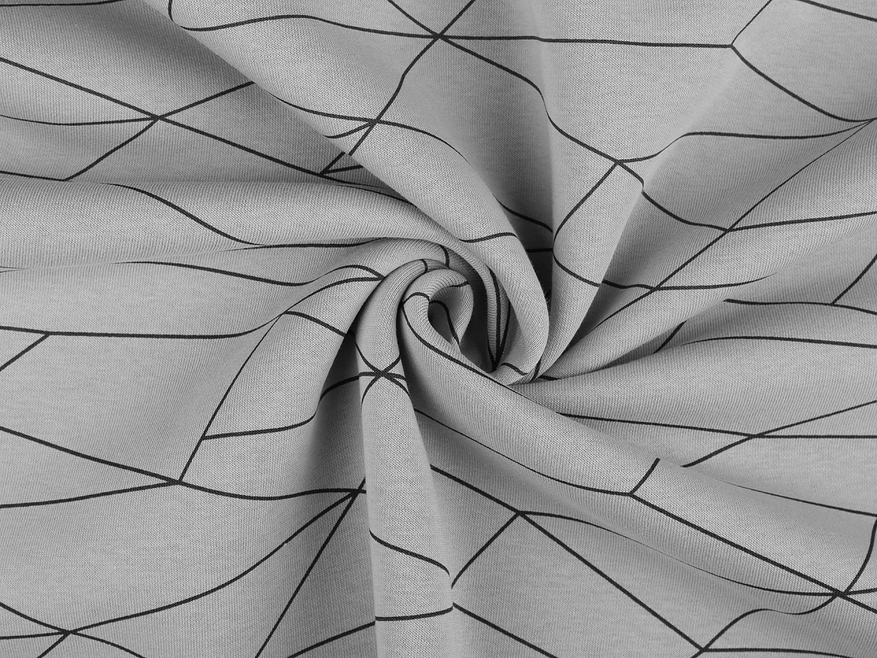 Počesaná teplákovina s geometrickým designem pruží do šíře i do délky. Z vnitřní strany má hřejivý chloupek, který je ideální do chladnějšího počasí. Její okraje se netřepí. Využijete ji na šití tepláků, mikin, legín, vest, čepic, kardiganů nebo teplejších šatů.