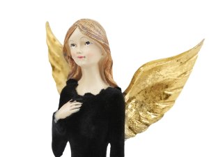 Soška anděla vyniká působivě sametově hebkými šaty a křídly pokrytými jemnými glitry. Má dobrou stabilitu.