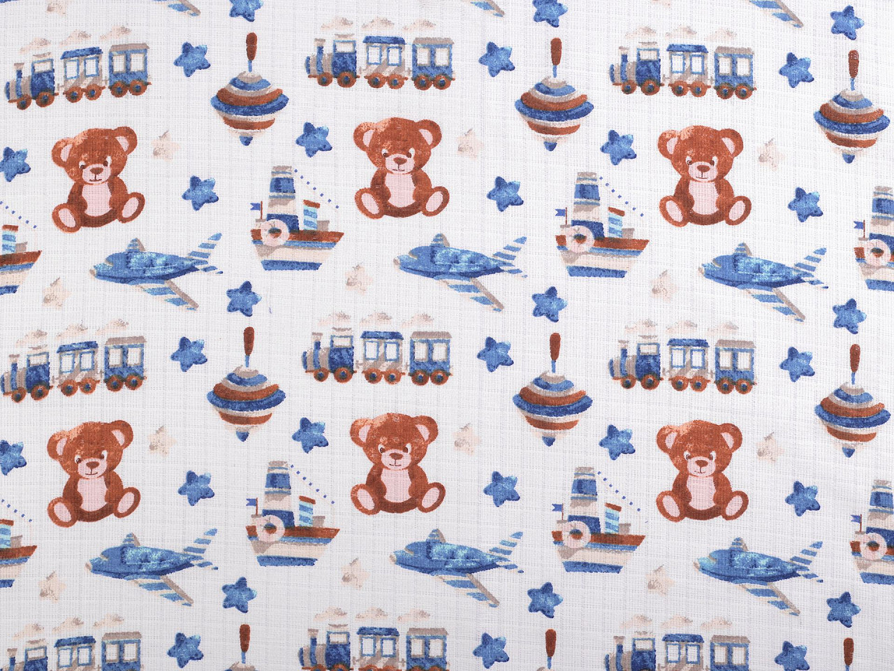 Bavlněnou plenkovinu s motivem medvídka a hraček využijete na šití plenek, baldachýnů, bryndáčků apod. Je vzdušná a příjemná na dotek.