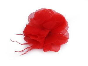 Romantický textilní květ z šifonu je dozdobený pírky. Má široké možnosti využití. Díky bohatým okvětním plátkům má nadýchaný vzhled.
