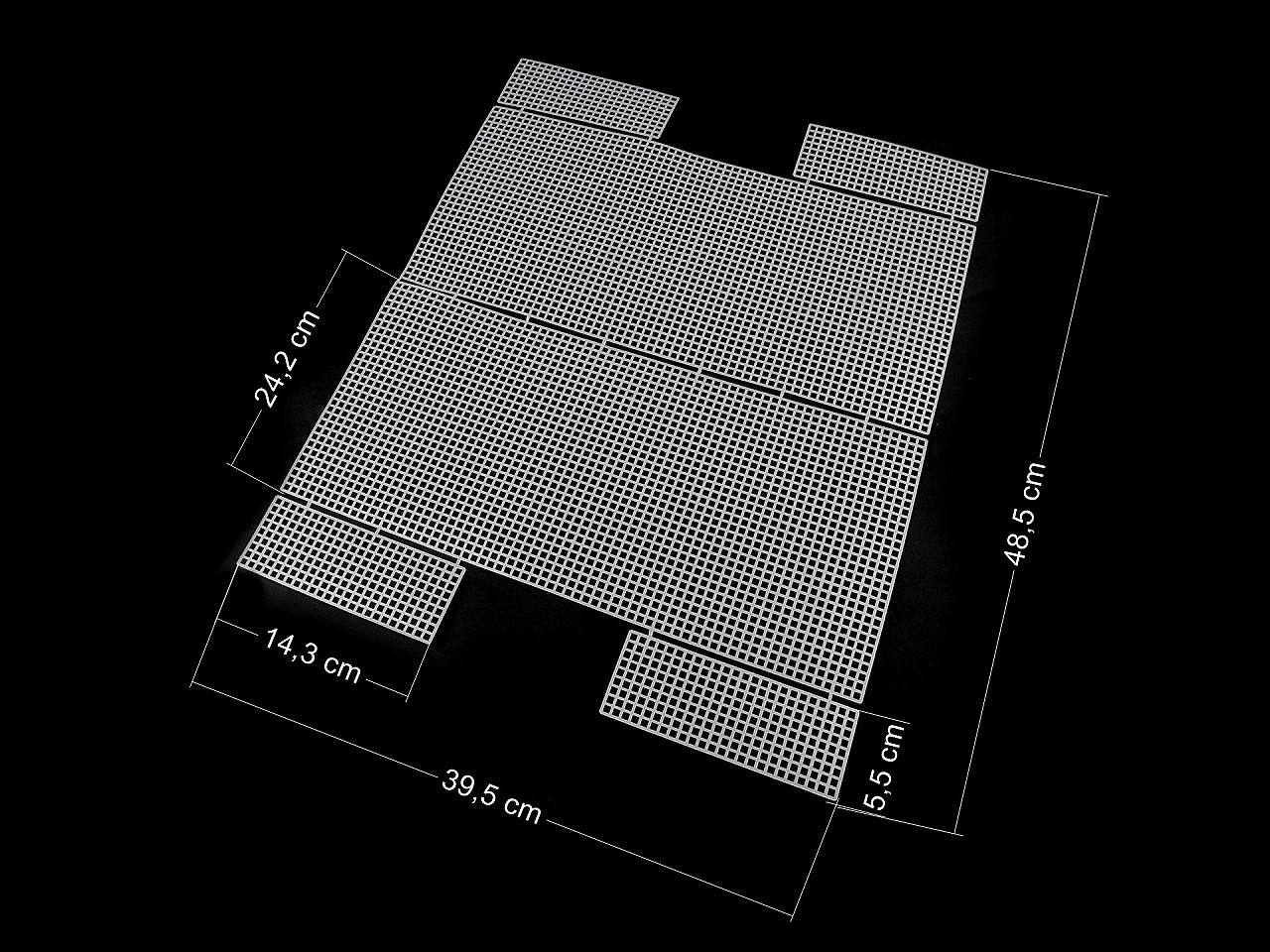 Plastová kanava je polotovar, ze kterého si můžete vyrobit dvě kabelky o rozměrech cca 19 x 14 x 5,5 cm. Na výrobu je vhodná silnější příze, která je určená k pletení či háčkování. Použít můžete i šňůru či odolnější stuhu (např. rypsovou). Kanavu po celém povrchu vyšijete přízí a sešijete po stranách.